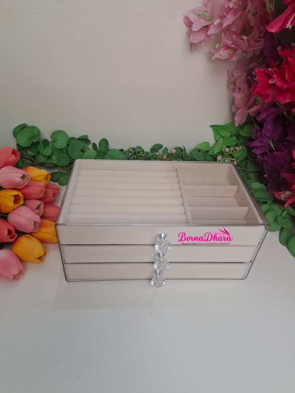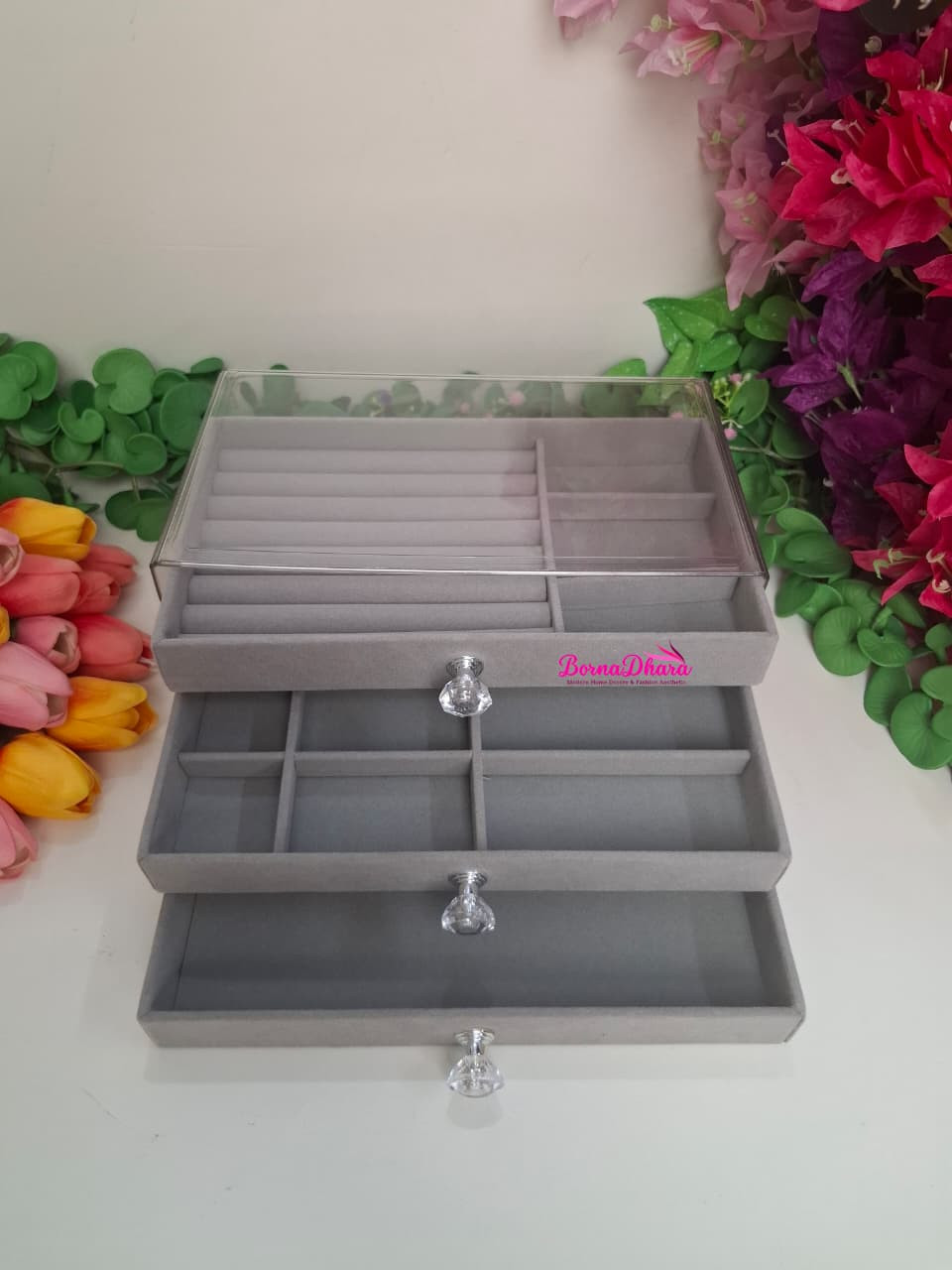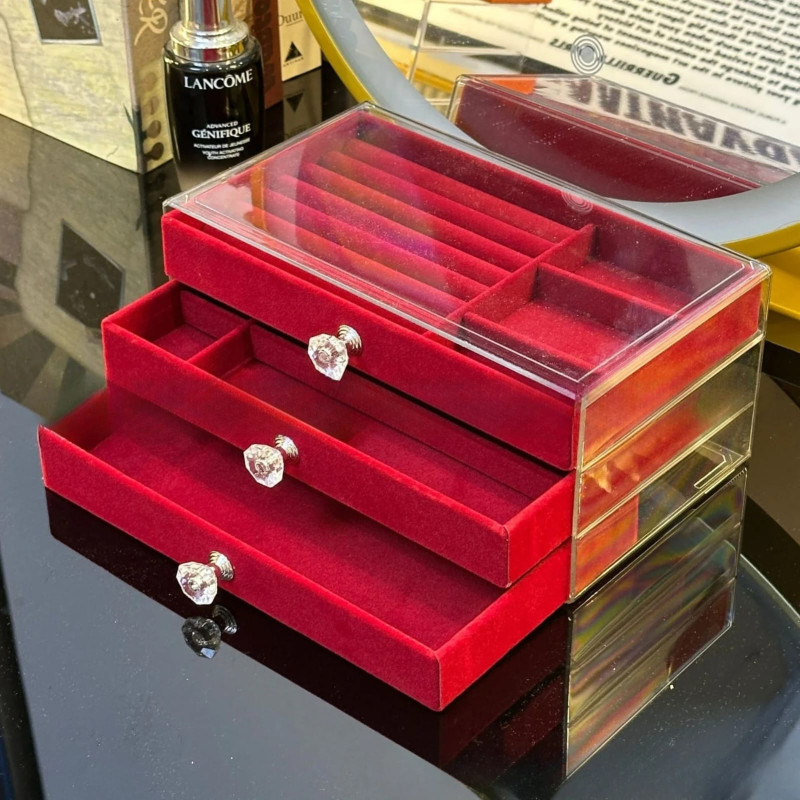 3 Layer Acrylic Velvet Jewelry Organizer Box আপনার প্রিয় জুয়েলারি সুন্দরভাবে সাজিয়ে এবং নিরাপদে সংরক্ষণ করার জন্য একটি elegant ও practical storage solution। Transparent acrylic lid থাকার কারণে box না খুলেও ভিতরের জিনিস সহজে দেখা যায়।