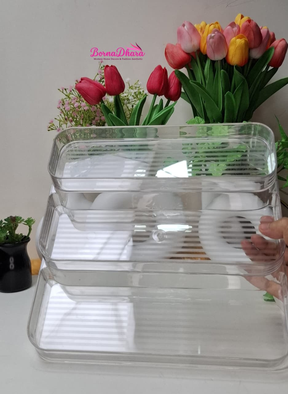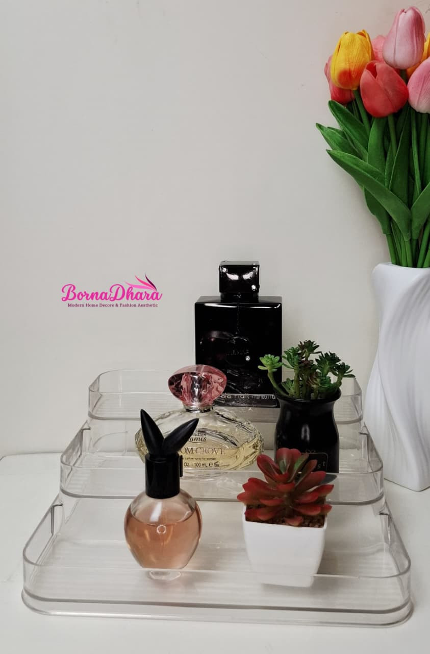 এই Transparent PET Plastic rack দেখতে একদম Crystal Clear, তাই ভিতরের বোতলগুলো সহজেই দেখা যায়। ড্রেসিং টেবিল, শেলফ বা বাথরুম কাউন্টার—সব জায়গাতেই এটি মানানসই। হালকা ও মজবুত ডিজাইন, তাই সহজে বহন করা যায় এবং দীর্ঘস্থায়ী।
