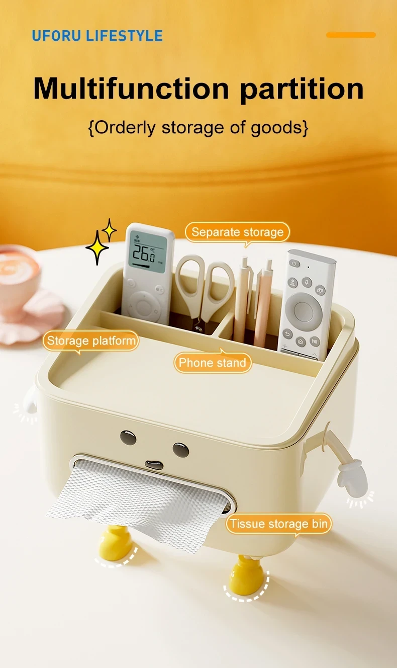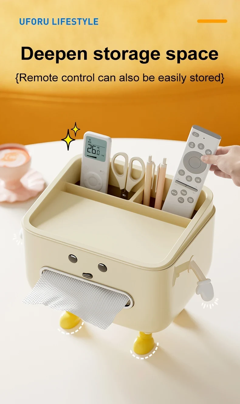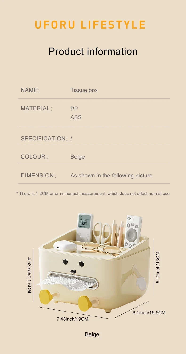 Stylish multipurpose Tissue Box যা আপনার home, office, bedroom—যেকোনো জায়গায় ব্যবহার করা যায়। Durable PP + ABS material, elegant Beige colour এবং উপরে extra storage space থাকায় ব্যবহার আরও সুবিধাজনক। Compact size হওয়ায় table বা desk-এর জন্য perfect।